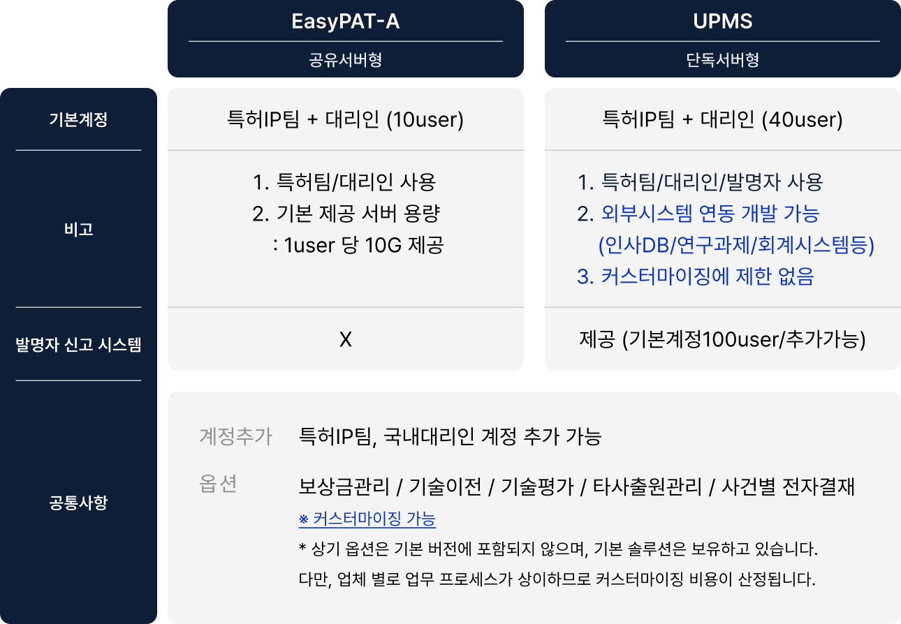 UPMS는 사용자의 권한에 따라 특허팀(지식재산권 관리팀), 발명자(연구원), 대리인(특허사무소)이 동시에 접속하여 지식재산권(특허, 실용, 디자인, 상표, 기타사건 등)을 관리합니다.